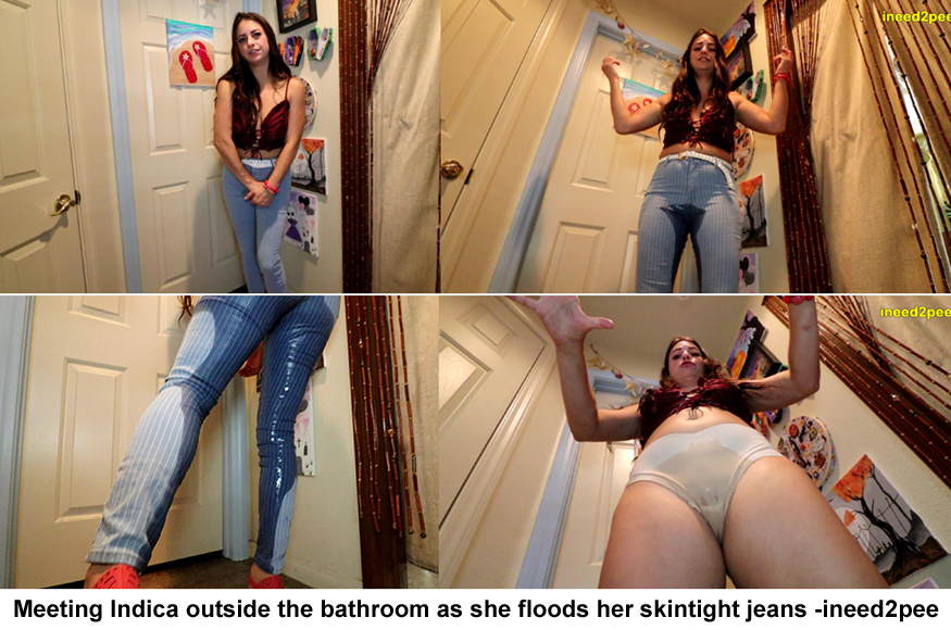 worse time; she needs to pee! Wearing classic, tight blue jeans,